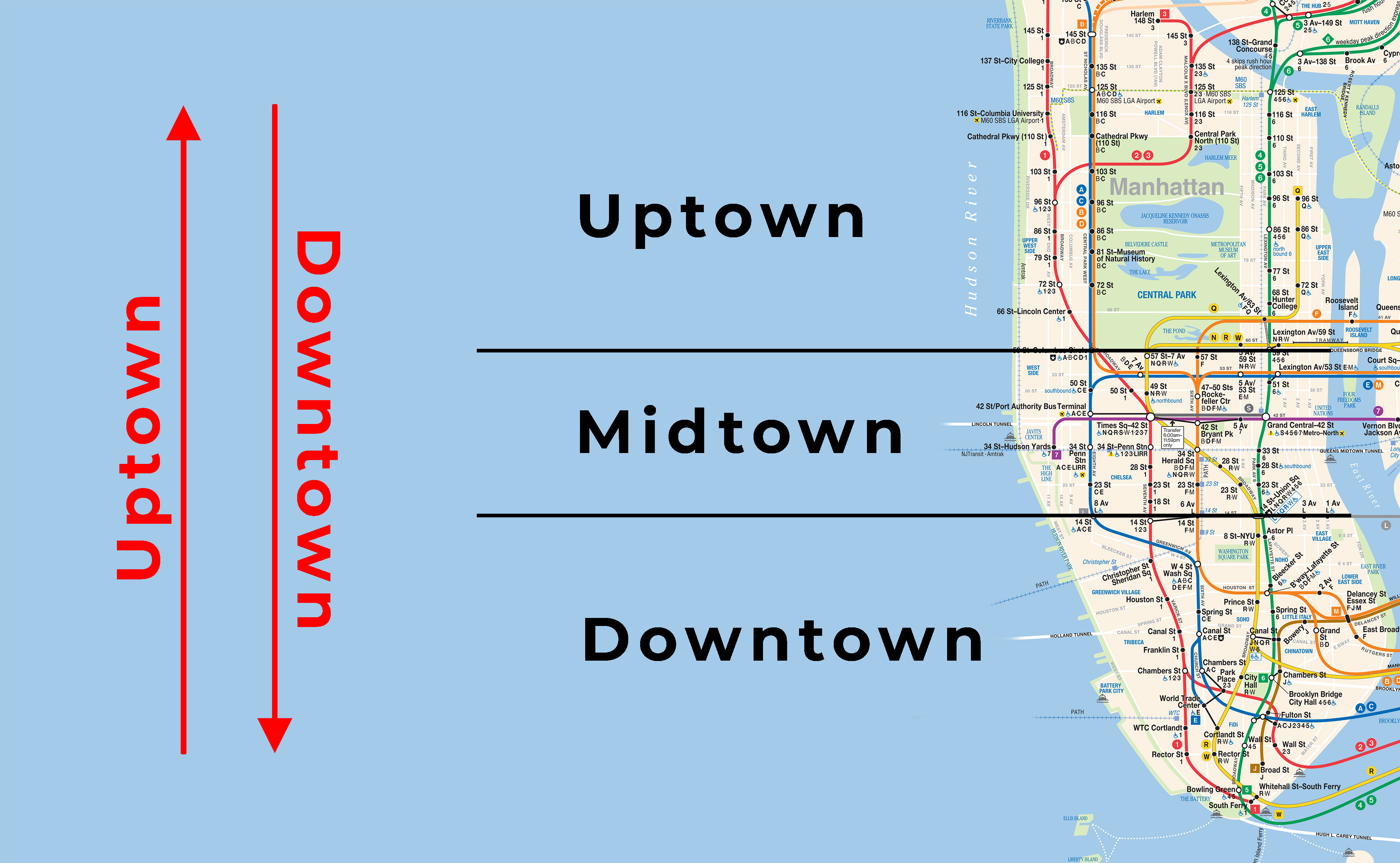 While Uptown, Midtown, and Downtown are geographic regions of Manhattan, the words uptown and downtown can also mean the direction of travel. If you head north (towards the Bronx or Queens), you are heading "uptown"; if you head south (or towards Brooklyn), you are heading "downtown." Locals rarely use the words "north" or "south" for that reason. We do however use "east" and "west" in Manhattan ("just walk two blocks east") even though it's not technically accurate. Navigating east and west is also referred to as "crosstown" as in "to get to the Upper East Side you have to take a crosstown bus through Central Park".