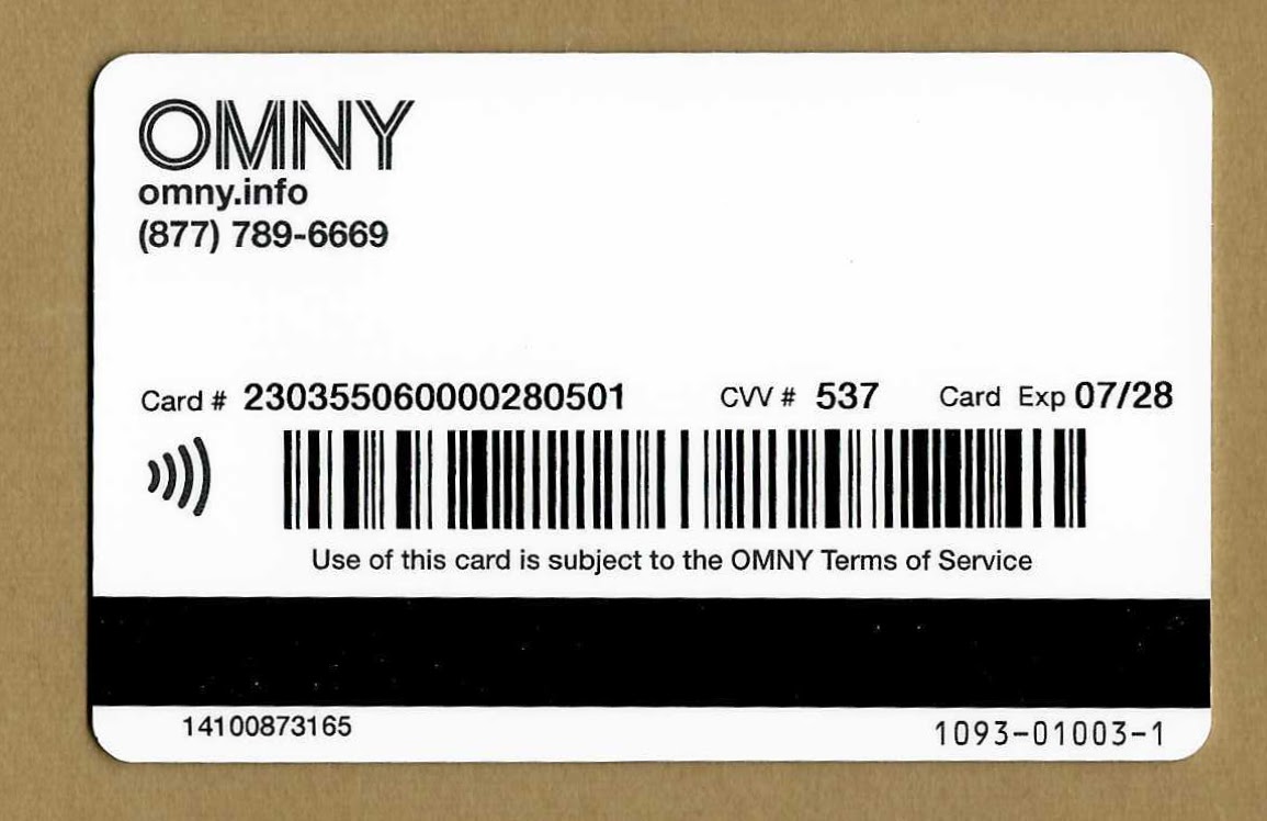 The OMNY card is a physical, plastic card. It is shaped like a credit card with the word OMNY in the front. It has barcodes both on the front as well as on the back of the card. The back side also has a magnetic stripe as well as an expiration date.