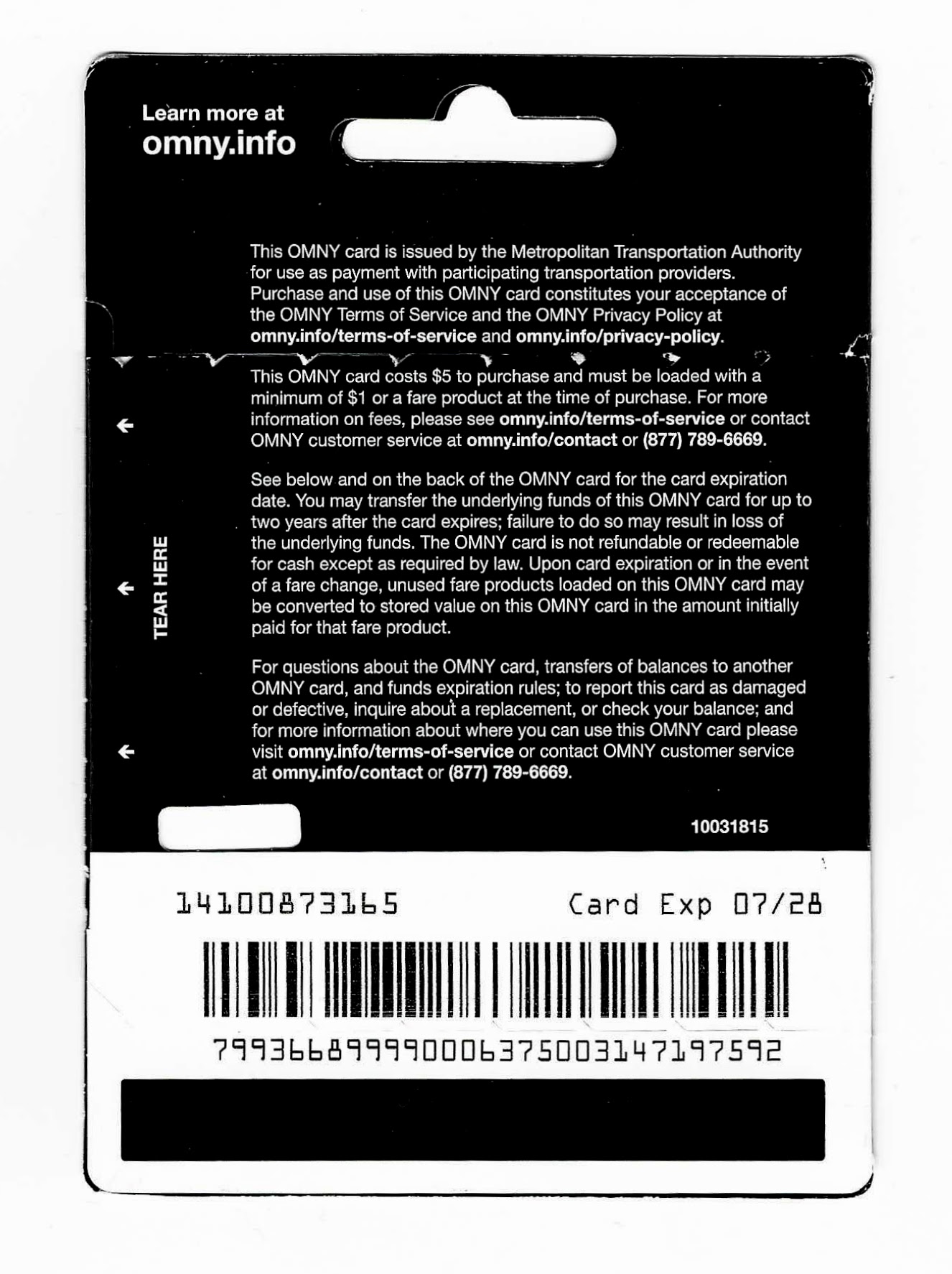 A word of caution: the OMNY card has a bunch of details in the back including an 18-digit card number, a CVV number and an expiration date. Using these information, anyone can register the card online and see the card's entire past usage including all the subway stations you have swiped in. As such, be careful about posting pictures of the card on social media.