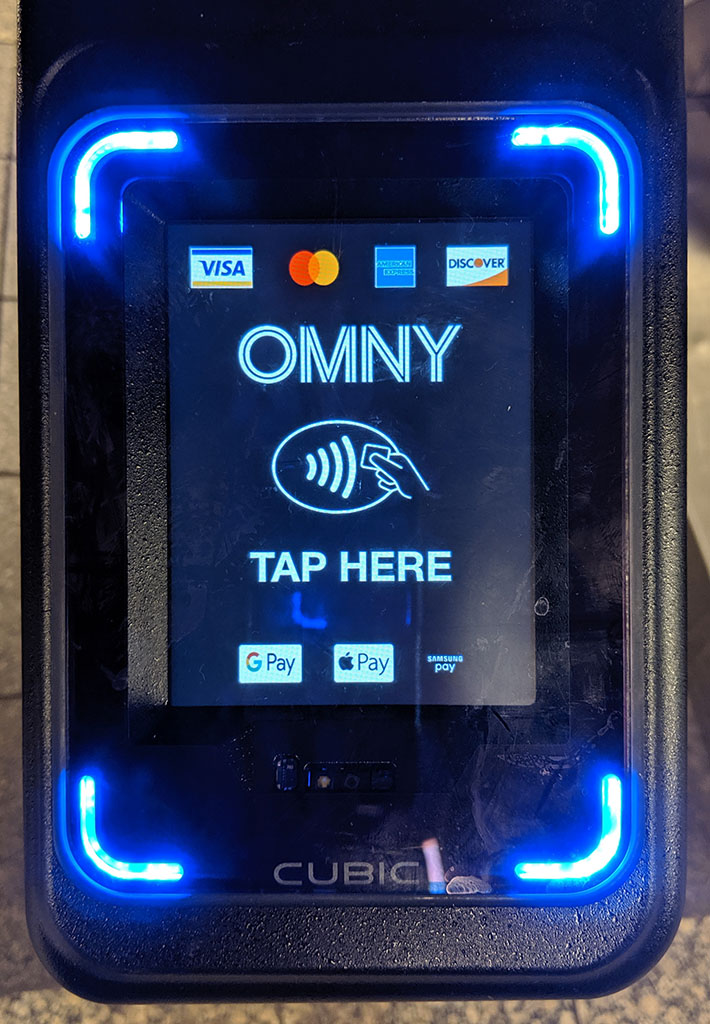 In order to use OMNY, first make sure that the reader has the four blue corner lights and says "OMNY TAP HERE":